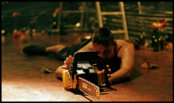 Lo otro, la atmósfera, lograda mediante una propuesta visual que asfixia a pesar de ser minimalista por la presencia de un objeto que no puede dejar indiferente a nadie: Una motosierra que logra al menos incomodar al público, al estar frente a un instrumento tan feroz. Por último, el leve pero insoslayable olor a bencina que emana del famoso aparato hace mas profunda la sensación de encierro y sordidez de la propuesta.